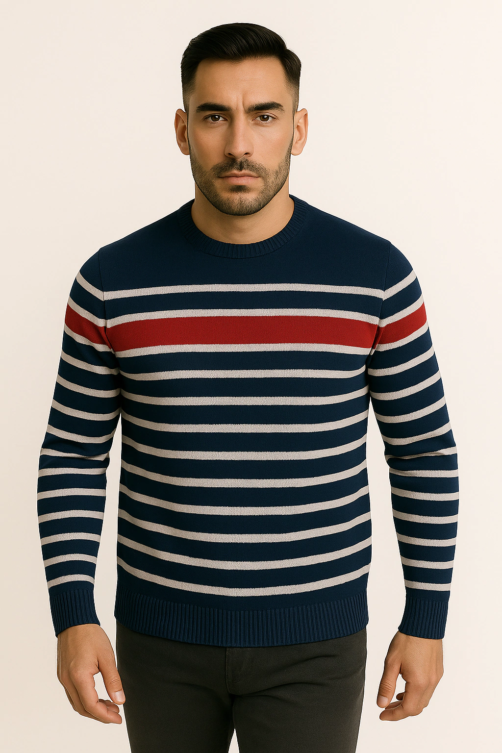 Este sweater, confeccionado en un hilado blend, presenta un atractivo diseño en gris melange con rayas azules y negras que lo convierten en una opción versátil para cualquier ocasión.